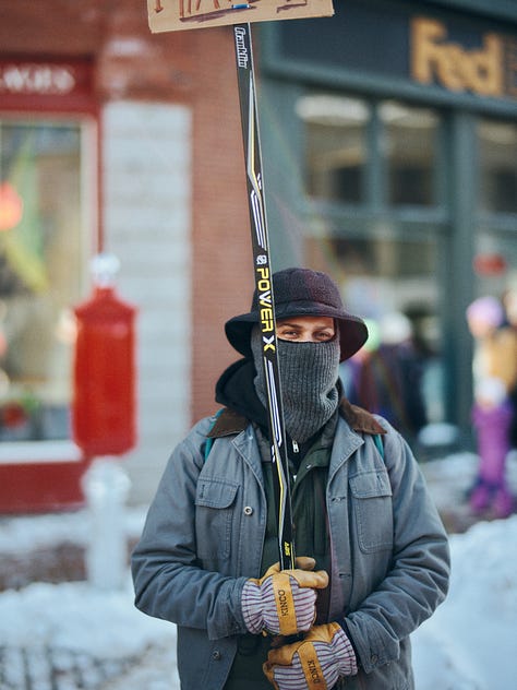 I slide a few steps to my right, where there’s a small pocket of space, and make another frame. The sign fits now, but the composition doesn’t sing. Time to change approach. I circle behind them and finally find an angle I like. The sign is less interesting from this side—FUCK ICE isn’t as inventive—but now I can see the hockey stick clearly, with a swarm of protesters layered behind.