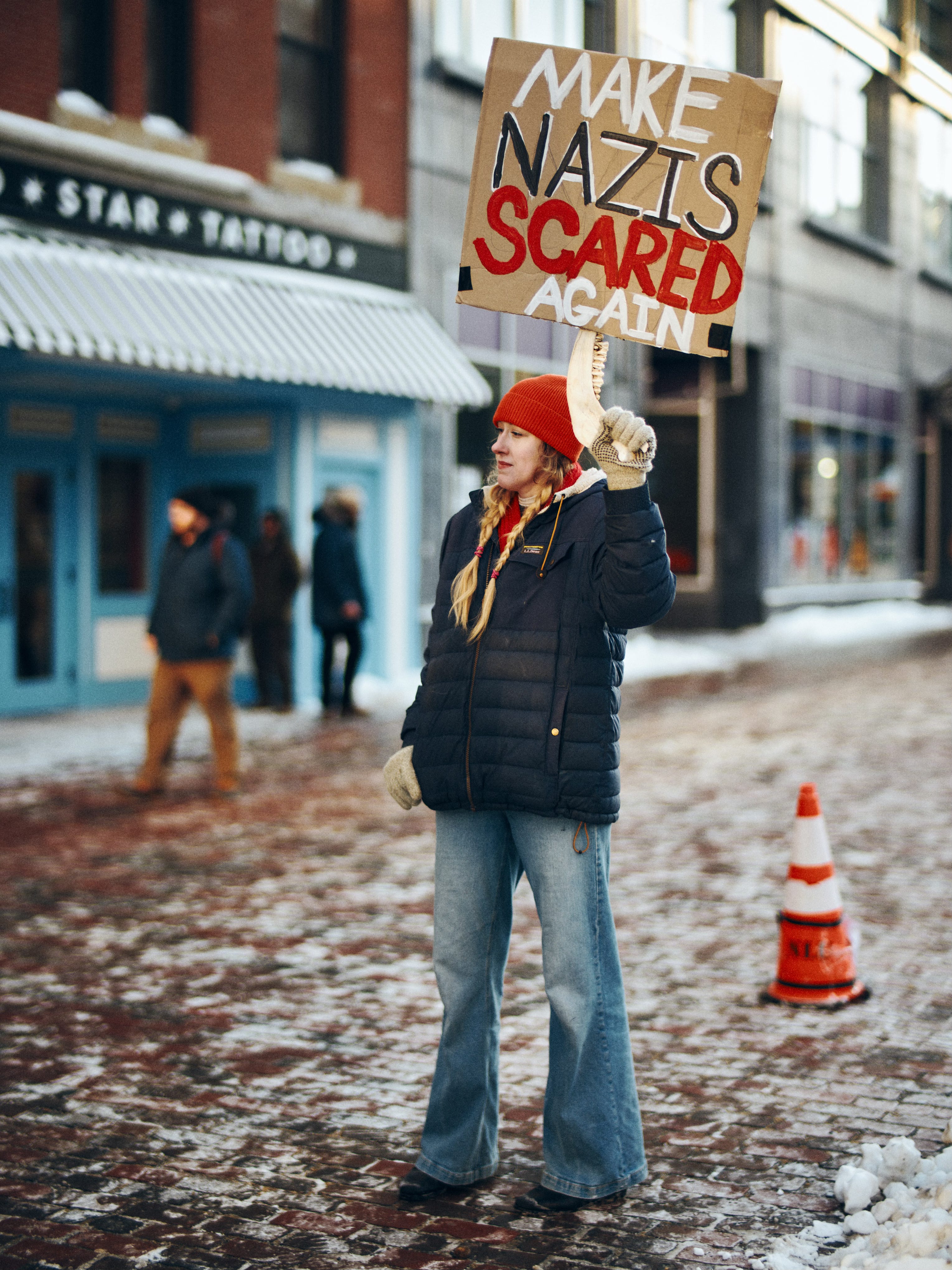 Then, walking back up Congress Street, one last portrait: a protester holding a Make Nazis Scared Again sign, taped to what appears to be a whale jaw. Fascinating. Colorful. Powerful. A fitting way to end an hour of shooting.