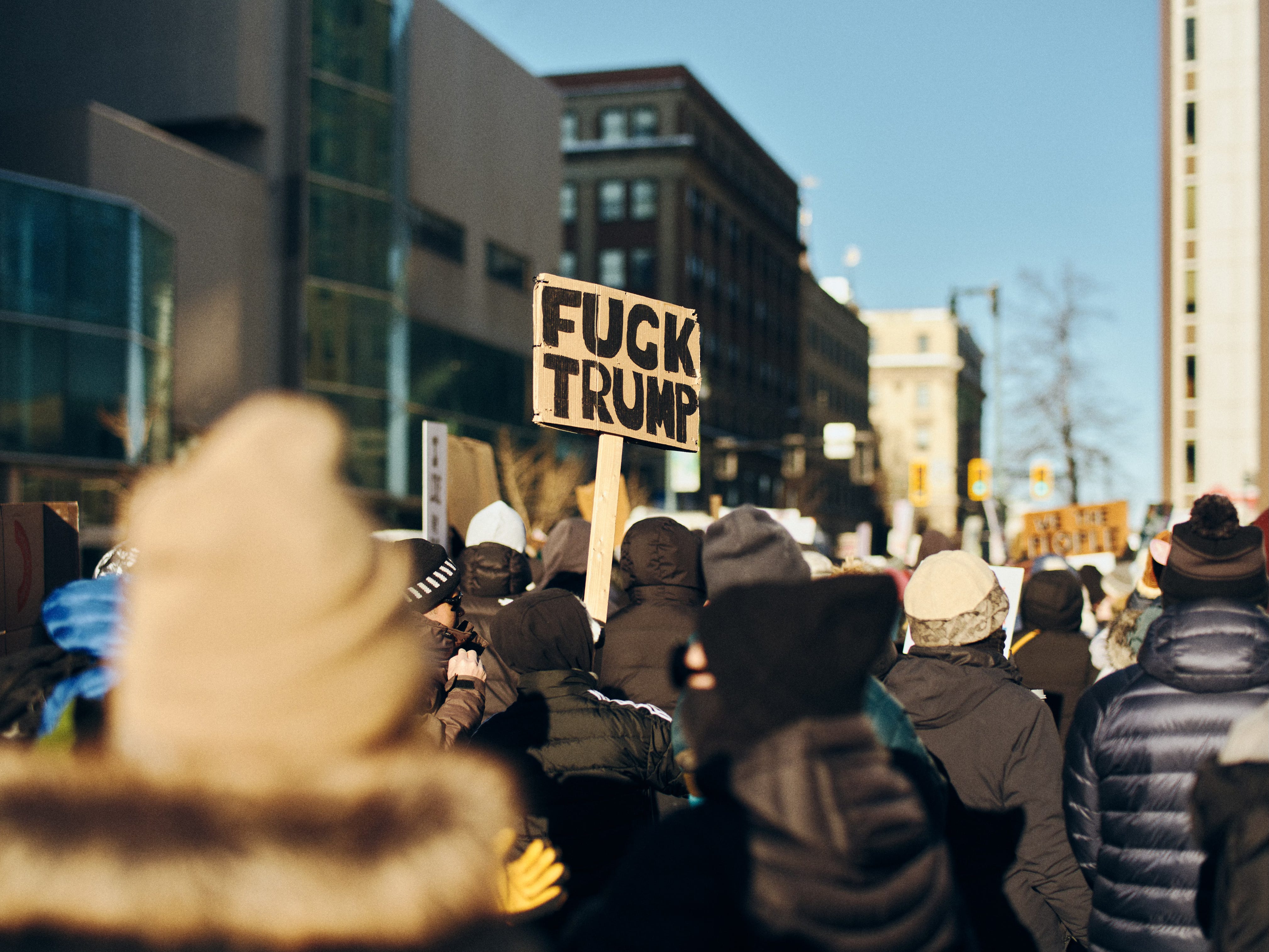 My first image of the protest comes as a large group of protesters walks into late-afternoon light spilling down Congress Street, one Fuck Trump sign held high and catching the sun. I miss focus on the first frame, but nail it on the second. Okay—I’m on the board.