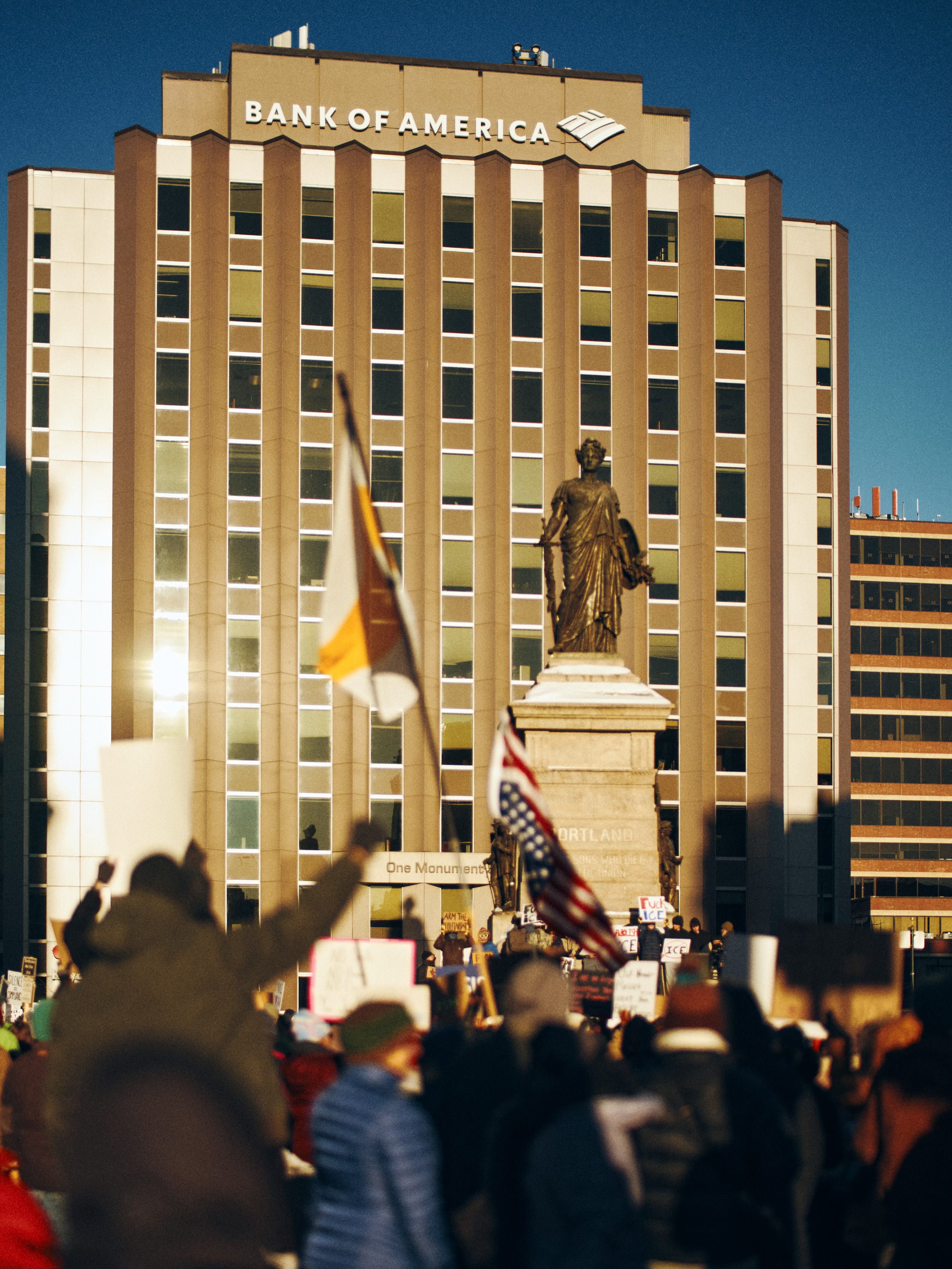 Eventually, I’m pulled back to the monument. A new tension jumps out at me: the speakers lean anti-capitalist, while a Bank of America logo looms over the entire scene—even the monument itself. If that’s not America, I don’t know what is. I never know whether viewers will follow this kind of visual argument, but that’s beside the point. The intent is clear to me. These may not be my strongest images, but they say something.