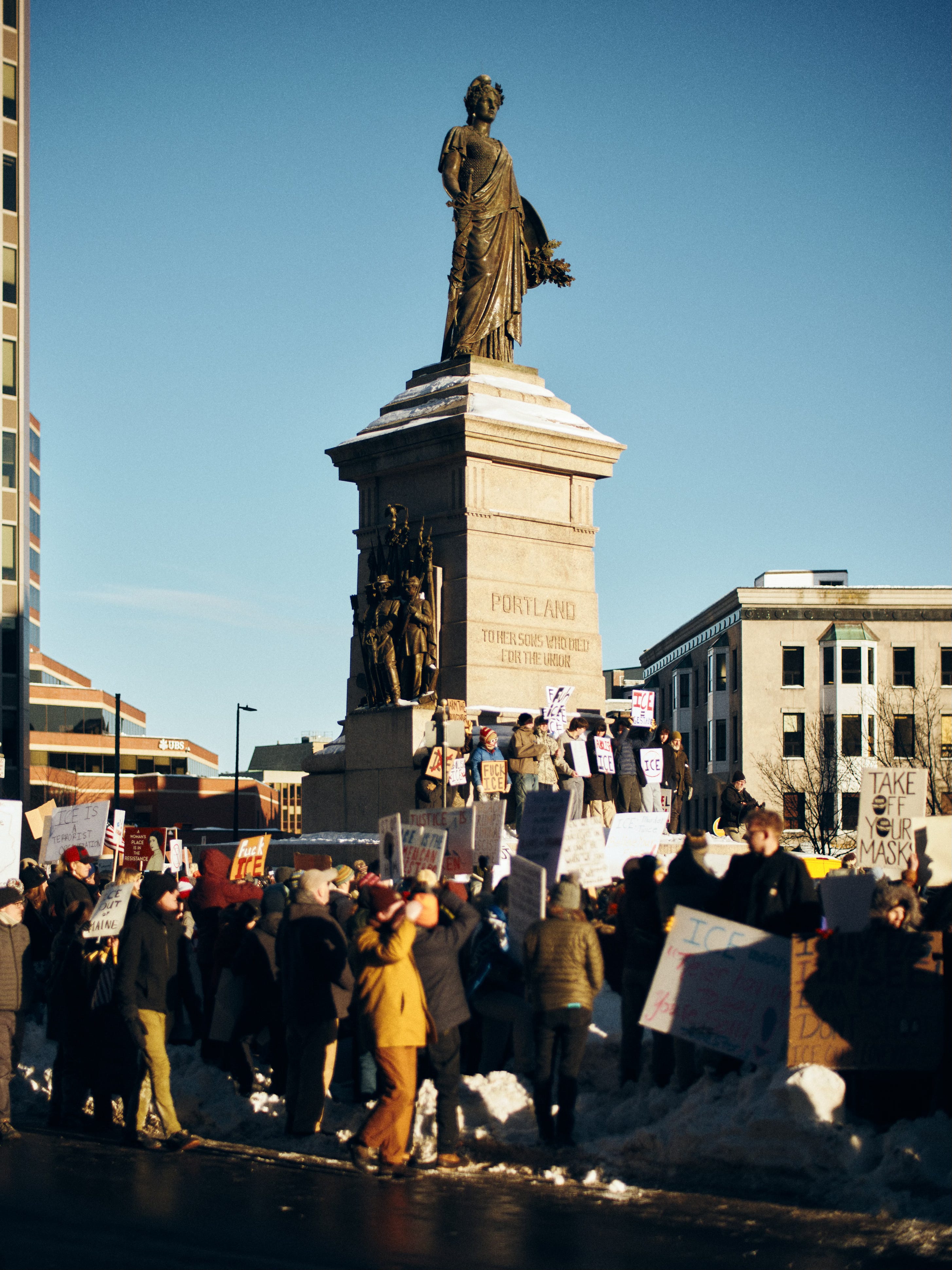My attention shifts to the monument at the center of Monument Square. There’s a powerful metaphor here: a memorial to Portland’s “brave sons who died for the Union” during the Civil War. It strikes me that there’s an uneasy poetry in gathering beneath a monument to people who once resisted regressive ideas, fought for human rights, and paid dearly for it. Standing here now, it’s hard not to wonder—again—what resistance will cost.