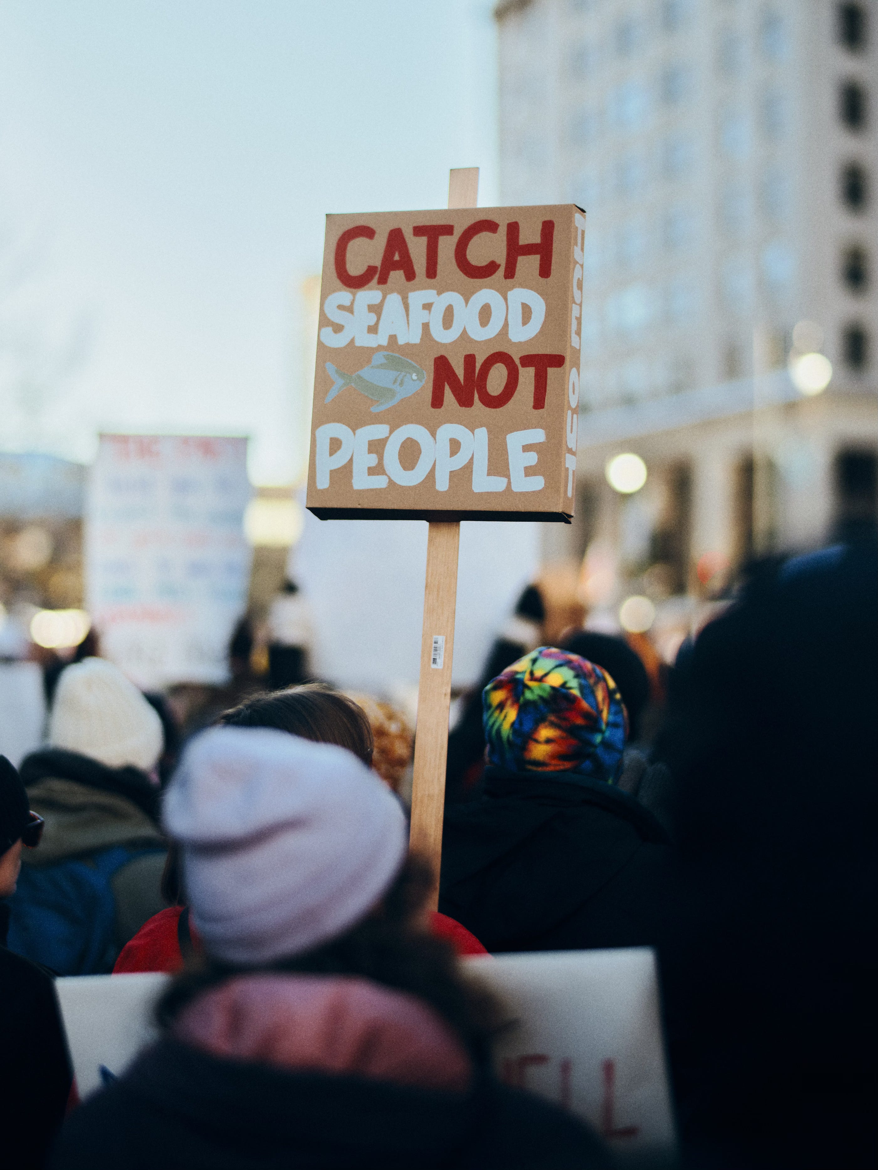 With the 50mm f/1.0–equivalent lens, I can use shallow depth of field to isolate subjects—a useful tool in an environment this busy. I work a series of images with single focal points—often signs or individual protesters—trying to convey the shoulder-to-shoulder density of the crowd. The lens also compresses space nicely, pulling the glass and stone façades of the Time and Temperature Building and the surrounding blocks upward in the frame. The effect anchors the protest in the city itself.