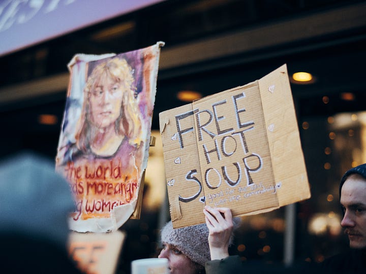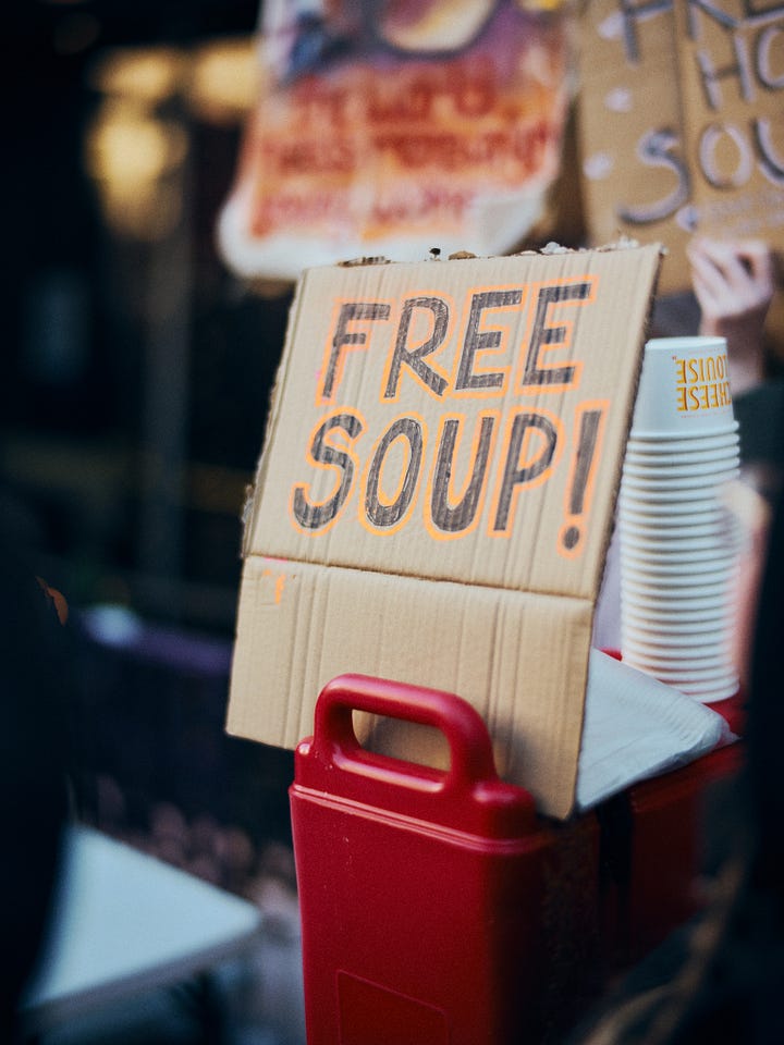 Earlier, I’d noticed a few spots offering free soup and hot chocolate to protesters—small, generous gestures that felt like an important counterpoint to any anti-protest rhetoric. I hurry back to where I saw Cheese Louise set up and make a few frames. They’re rushed. Several are out of focus. I don’t think I did this part of the story full justice.