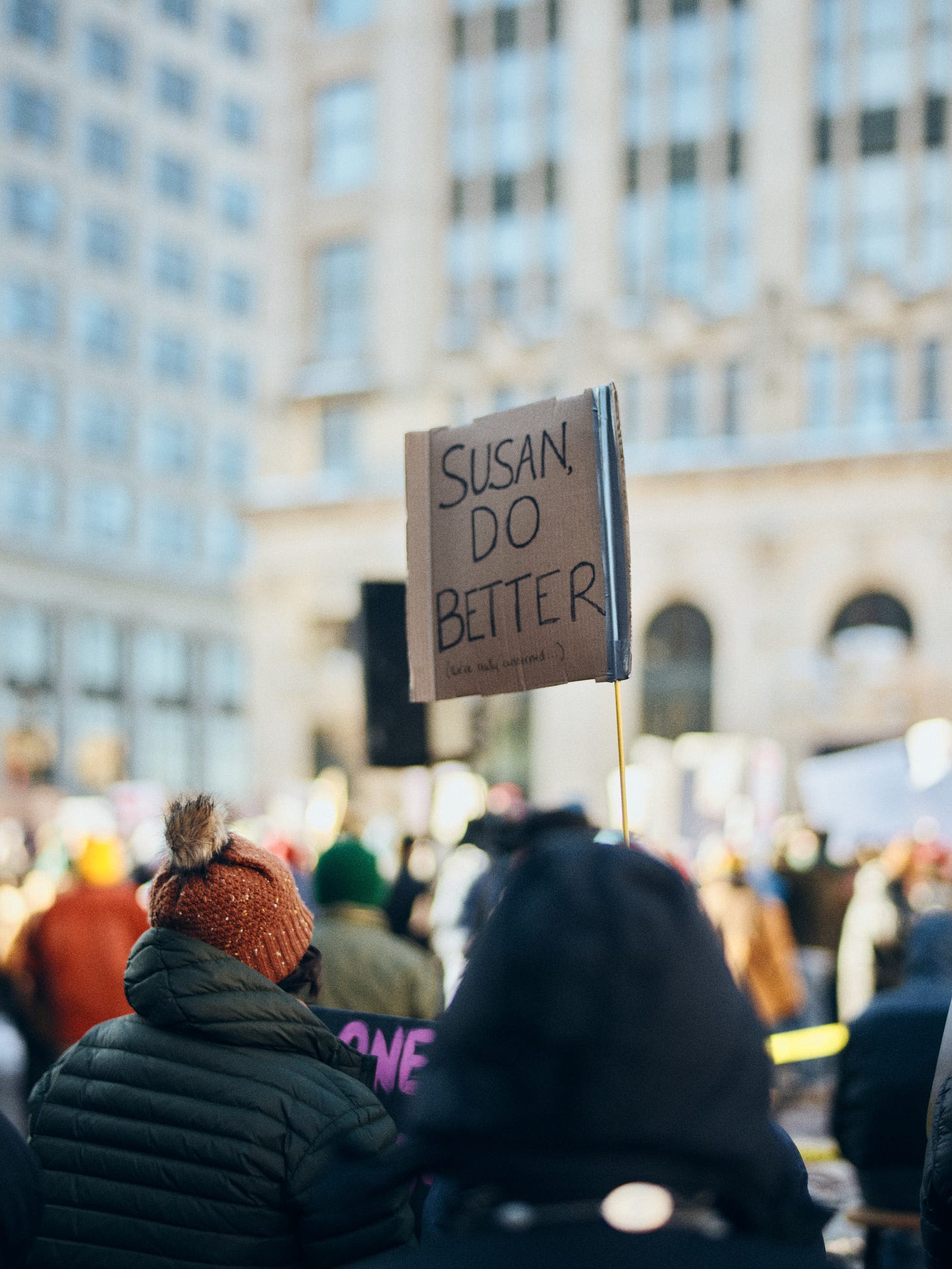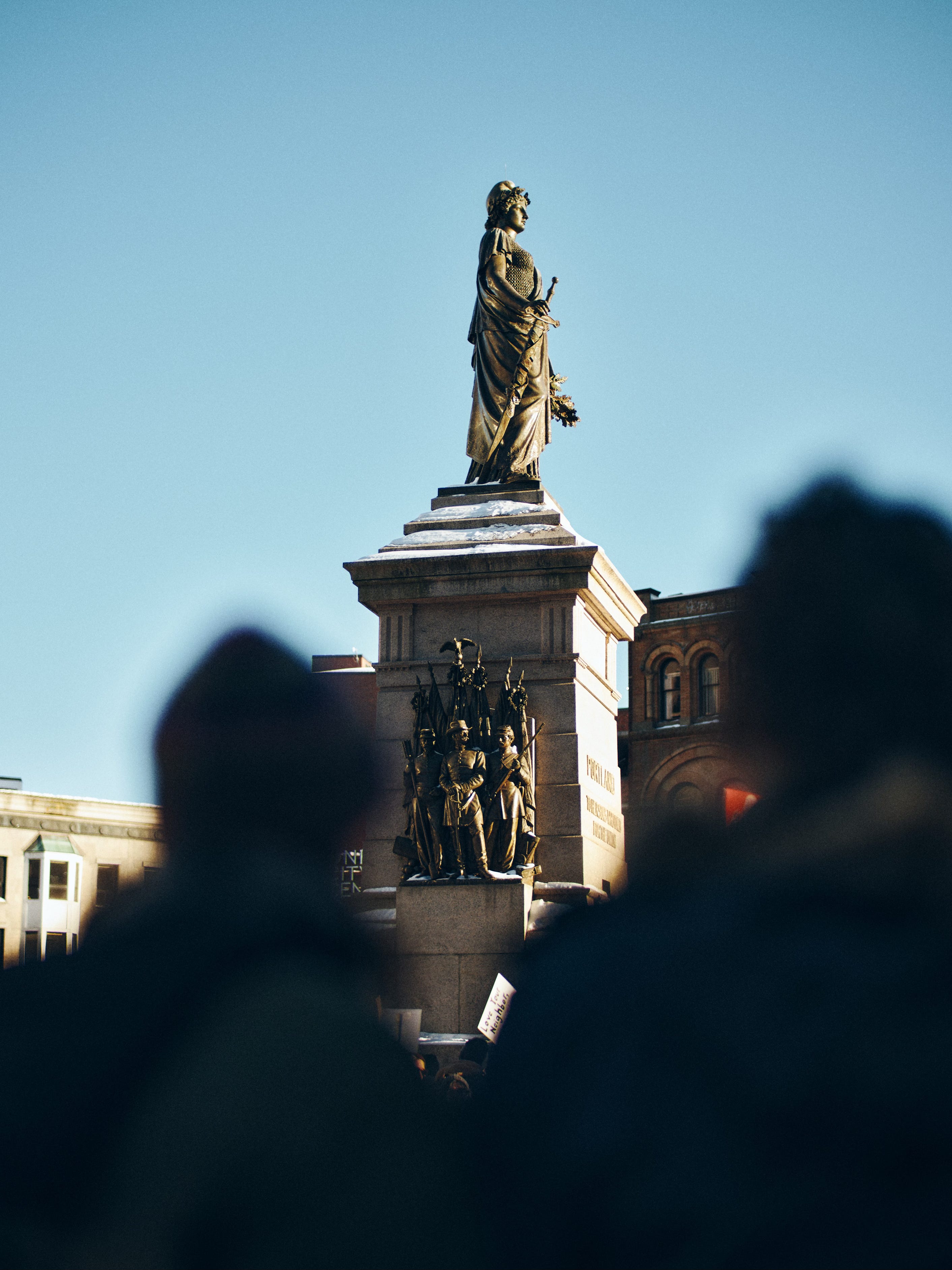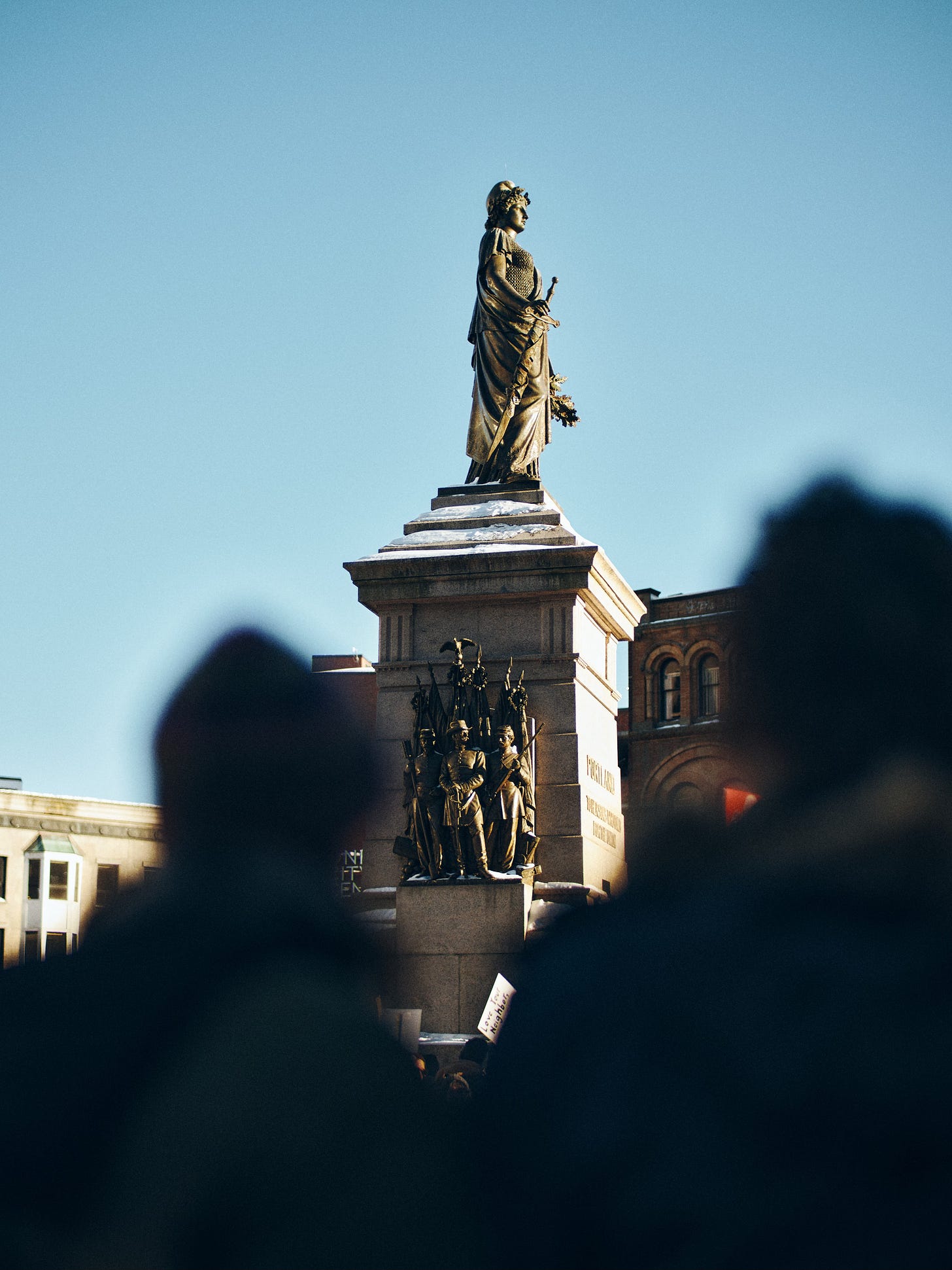 I move across Congress Street and try again. Now we’re getting somewhere. I finally have a composition that holds both the monument and the crowd. The diagonal edge of the road bothers me, though. What if I cut the midground entirely—frame the monument with two completely out-of-focus protesters in the foreground? I try it. That works.