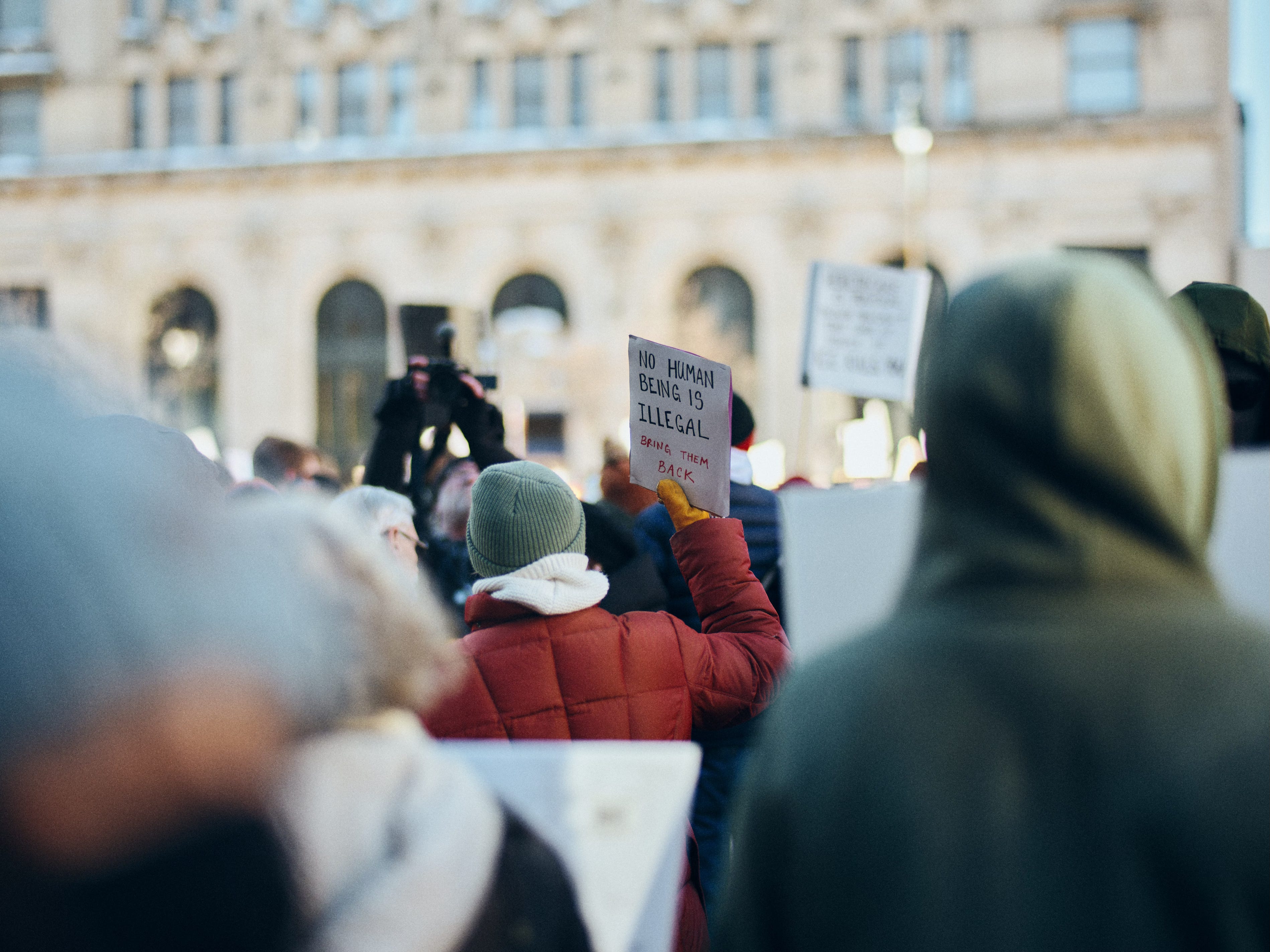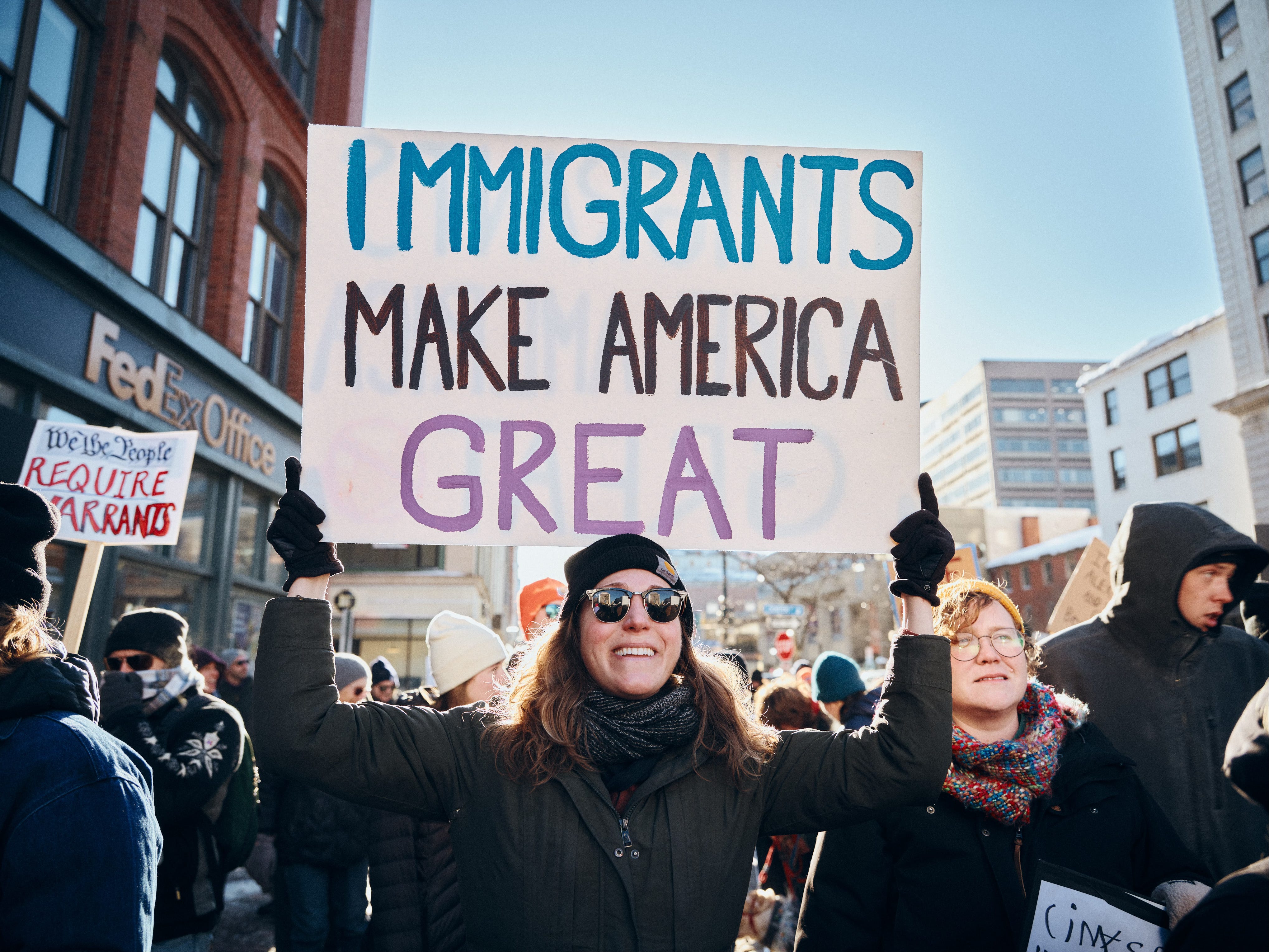 I start with a backlit portrait of a protester holding a sign that reads Immigrants Make America Great. I shoot it at 24mm—closer and wider than I’d normally use for a portrait—but the perspective gives a stronger sense of scale and place than the earlier 50mm images.
