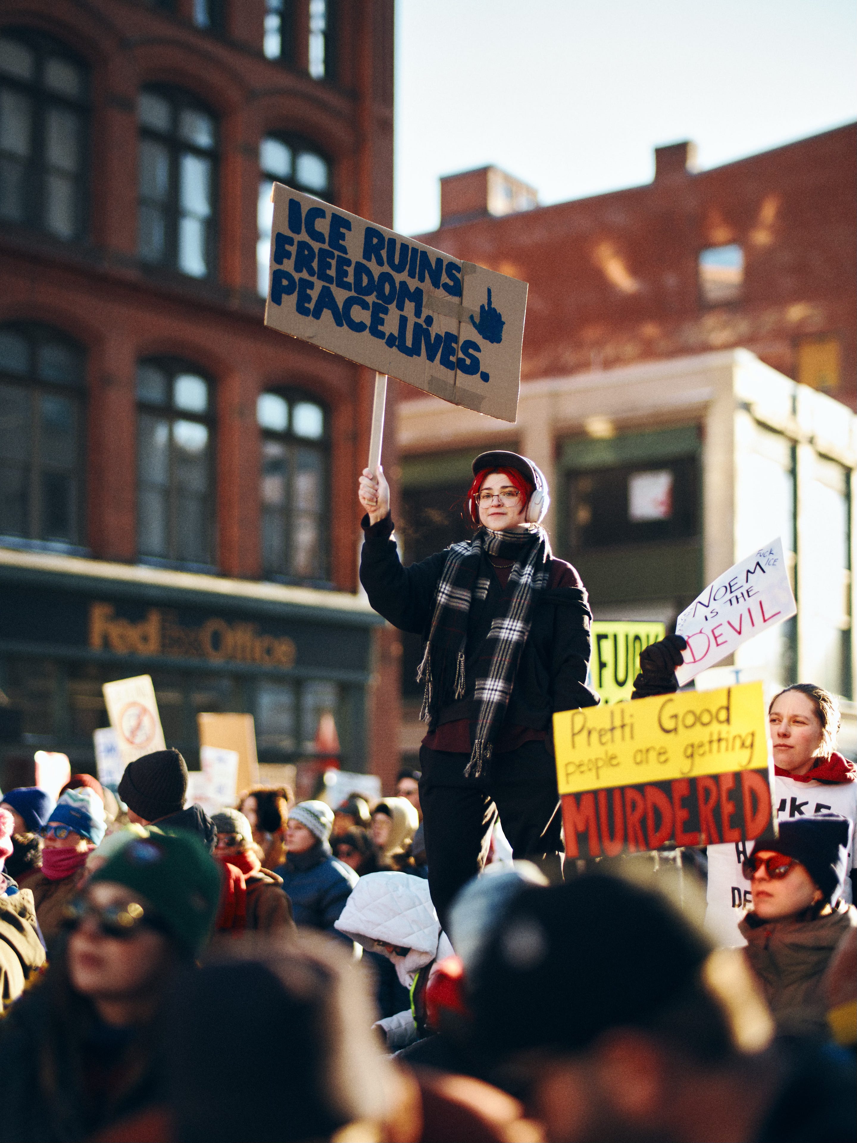 On my way into the office earlier, I noticed several mailboxes and utility boxes tagged in yellow spray paint, denouncing ICE. I know these won’t be the most compelling images of the day, but they’re a good place to start. If they work, they can function as B-roll—context-setting details that support the larger story. There’s no pressure.