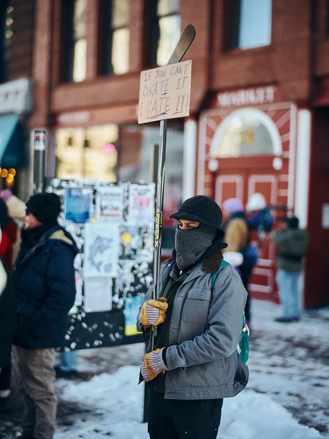Behind me, a protester in a black fleece bucket hat raises a sign mounted on a hockey stick: If you can’t skate it, I hate it! It catches my eye.