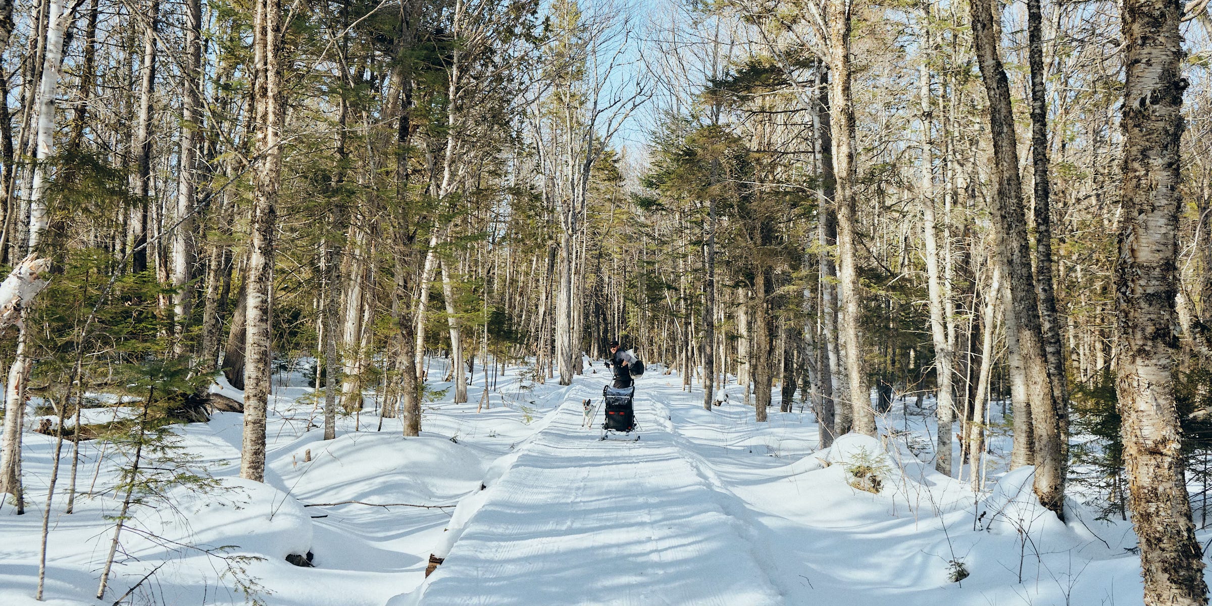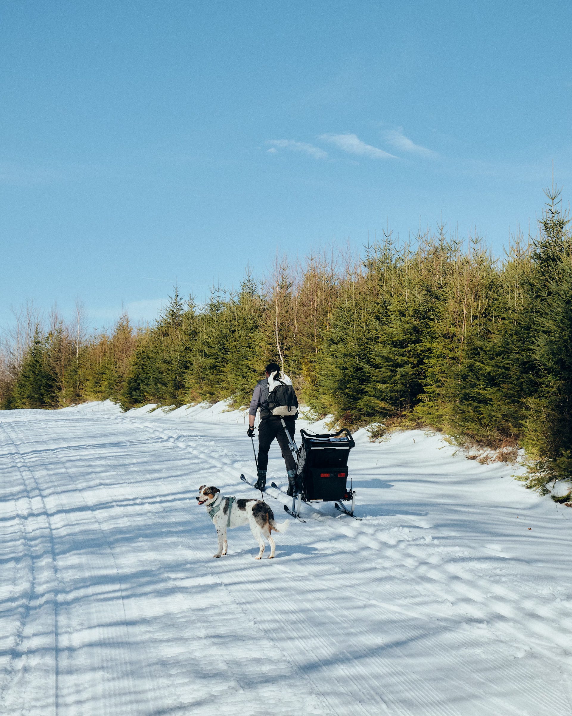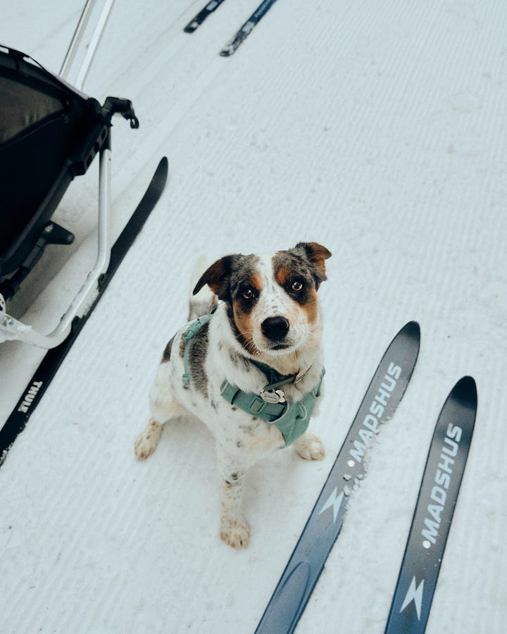 With the click of Elliot’s seatbelt in the Chariot, a countdown begins—if we don’t get moving very quickly, there’s about to be a screaming infant. With haste, I drop my chunky new Madshus backcountry Nordic skis down into the snow, where they land with a splat on the mushy trail that has the texture of mashed potatoes. We won’t be setting any speed records today—the snow, while holding up better than the access road, is still quite soft and slushy. I click my backcountry boots in, tap my poles, and glance around. Christine is clipped in, camera in hand, and Kiwi is trotting around with her new favorite stick lodged between her teeth. Even Elliot is happy with this efficiency—still twirling her pacifier in her hands, while giving me a look like, ‘Ready when you are, Dad!’