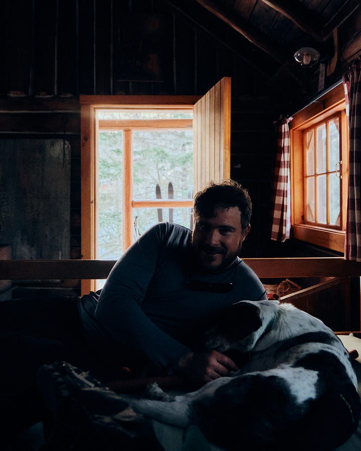 We head out, bellies full of bacon, egg, and maple syrup-soaked waffles. Yesterday’s conditions feel like a fever-dream—today I’m fighting for every ounce of grip on the slippery climbs, and those measured descents have given way to high-speed roller coaster rides on two Madshus metal-edged rails. Thirty-odd years of ski experience, put to the test. Both parents are grinning widely, Kiwi joyous, her long tongue lolling to the right, Elliot cooing with glee.