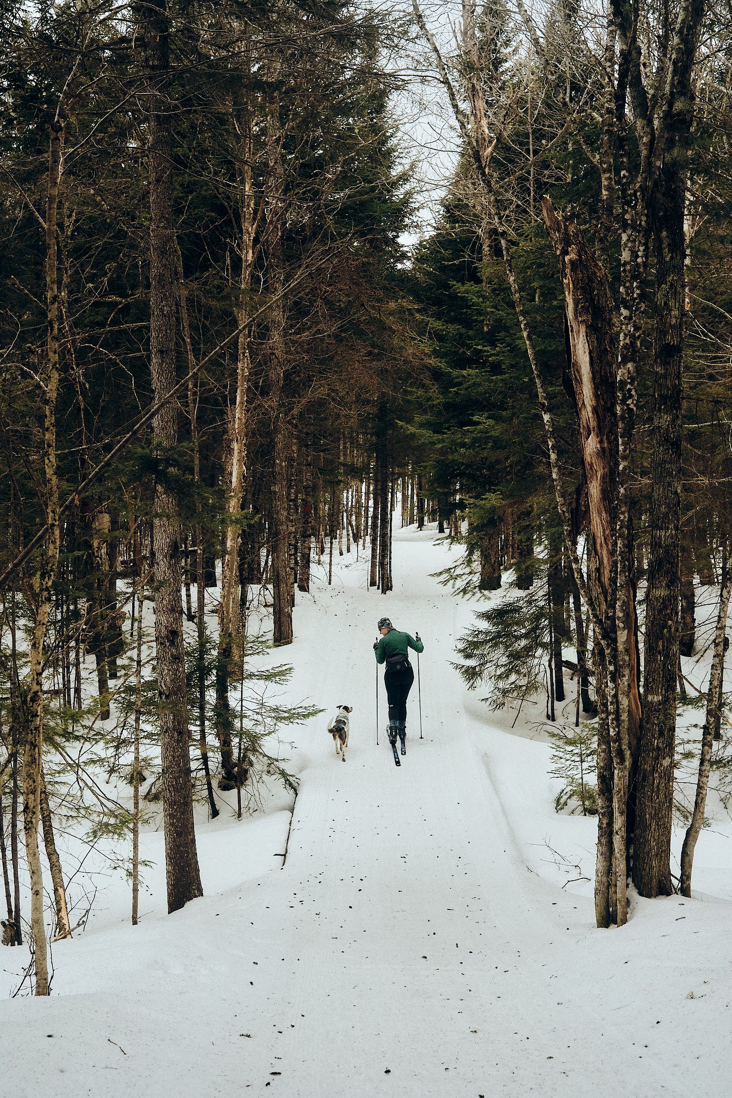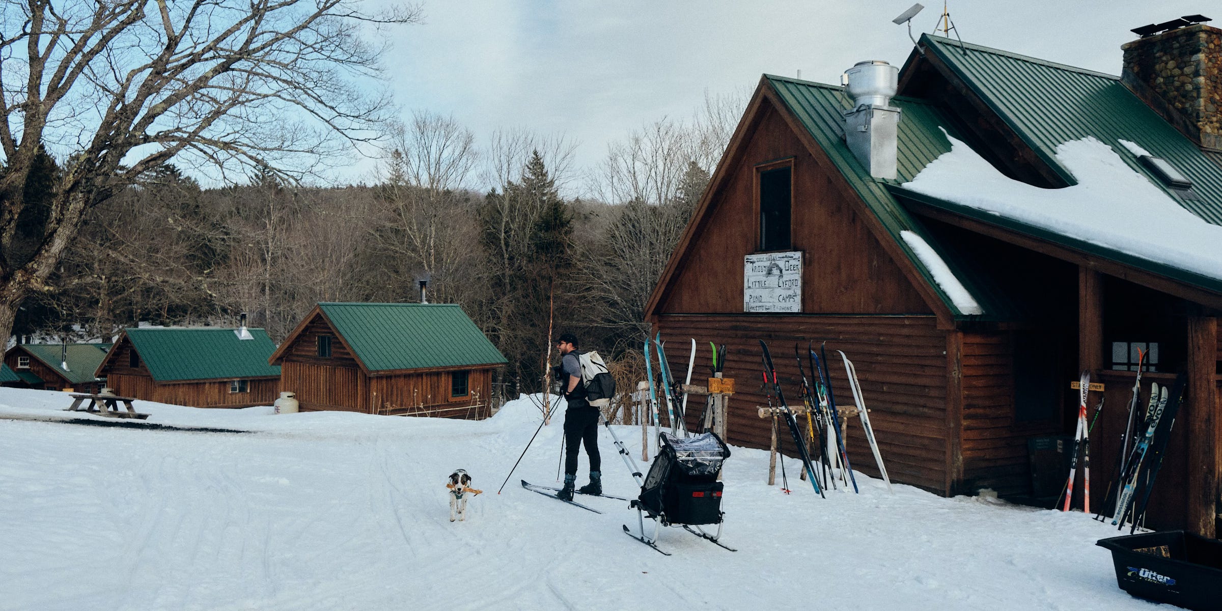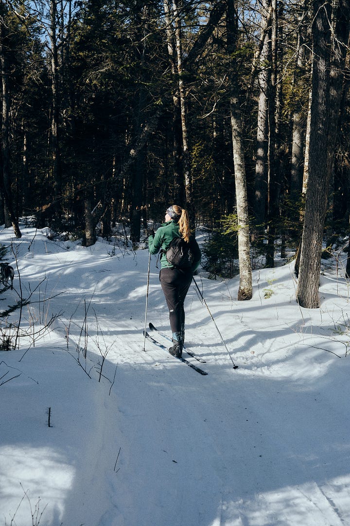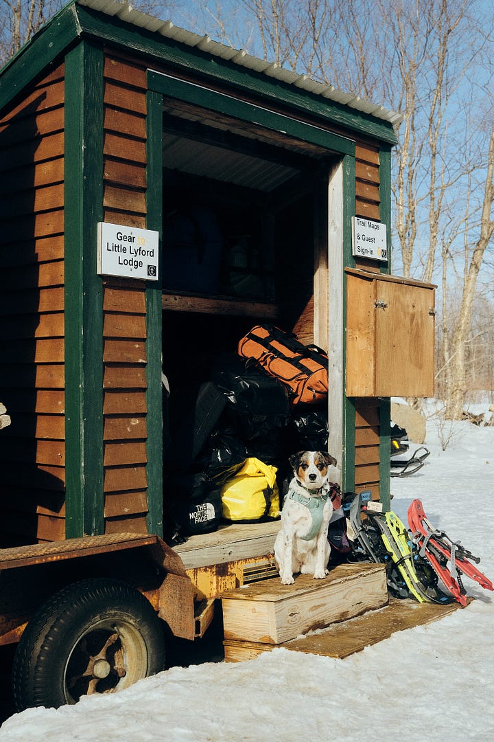 Right as our legs are starting to feel the burn, the Hedgehog Gate Trail spits us out on the Upper Valley Road—another wide, expertly groomed, winter highway. From here, we just need to make one last turn, then a sweeping descent right to Little Lyford Lodge. I set off on the last downhill, Christine right on my tail, Kiwi in a long loping gait to my left, oversized stick still lodged in her jaws.