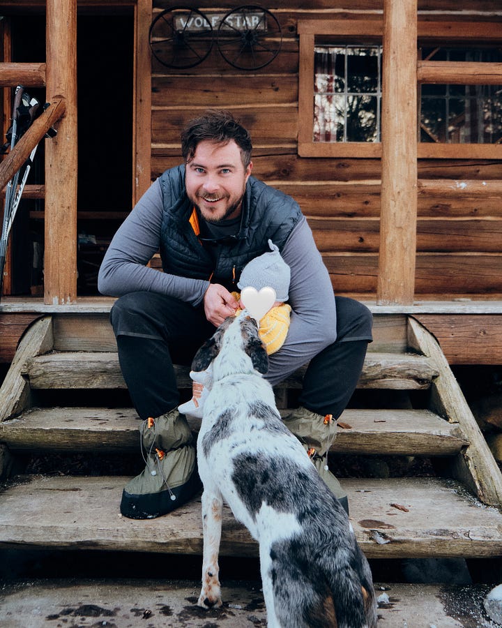 In years past, we may have bee-lined for the very inviting sauna, but instead we settle into our cabin for tonight—Wolf Star. The hut staff has the woodstove cranking on our arrival, perhaps too much for a day in the forties (maybe we would get to sauna after all!), but what a lovely treat to arrive at an already toasty cabin! Christine feeds Elliot while I get our gear inside, Elliot’s crib setup, and work to get Kiwi accustomed to our home for the evening. She also needs to be acquainted with the other four-legged friends at camp tonight: Oakley and Amber, two big and fluffy golden retrievers!
